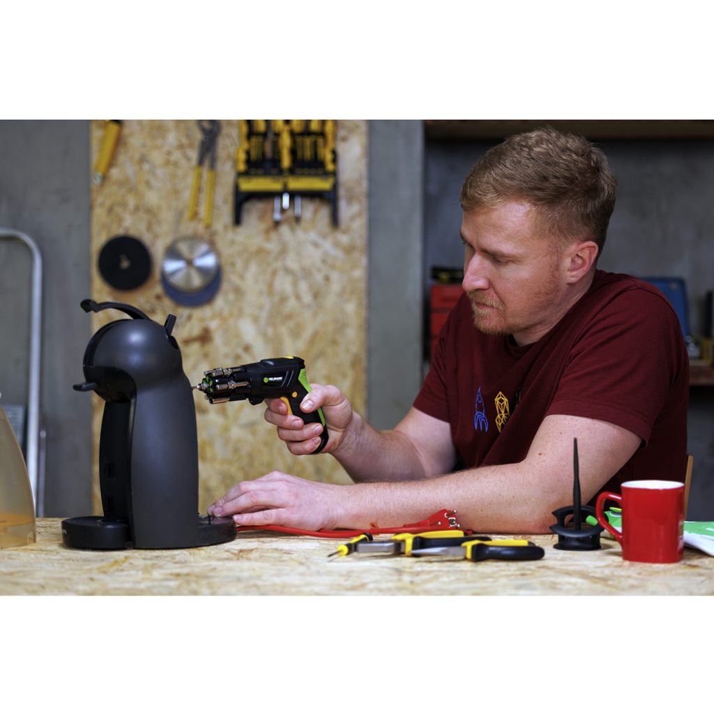 Na hlavici s bitmi je umiestnený nadstavec, ktorý slúži ako redukcia na krátke bity. Tento ľahký akumulátorový skrutkovač je možné držať ako pištoľ, alebo po stlačení prepínača otočiť rukoväť v smere hodinových ručičiek až do zacvaknutia (rukoväť sa dostane do horizontálnej pozície vzhľadom k hlavici skrutkovača).