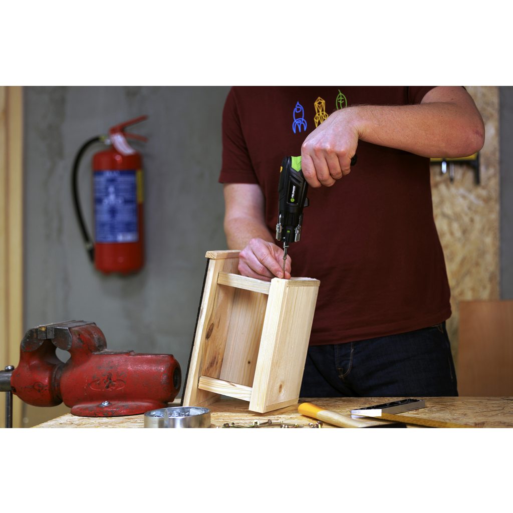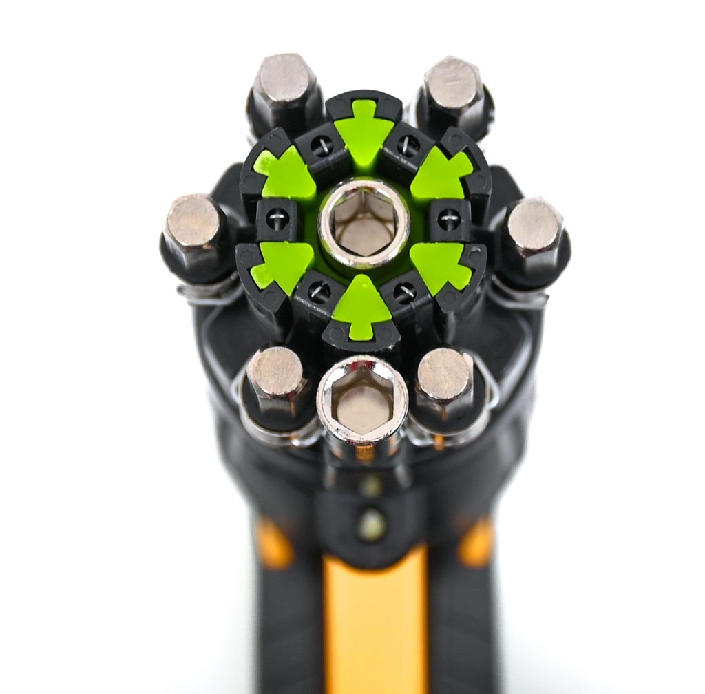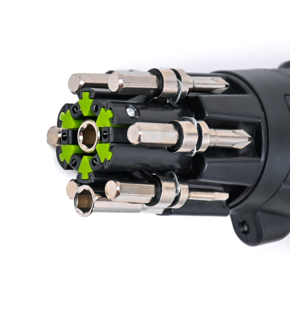 Tento aku skrutkovač disponuje hlavicou so šiestimi bitmi umiestnenými v zásobníku na otočných ramenách, čo umožňuje ľahkú výmenu jednotlivých bitov a znižuje riziko ich straty. Požadovaný bit sa jednoducho vyklopí z úložnej pozície a zasunie do skľučovadla.