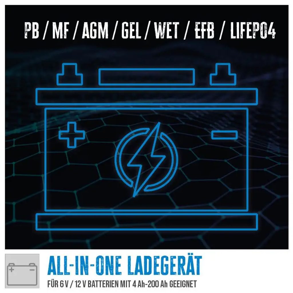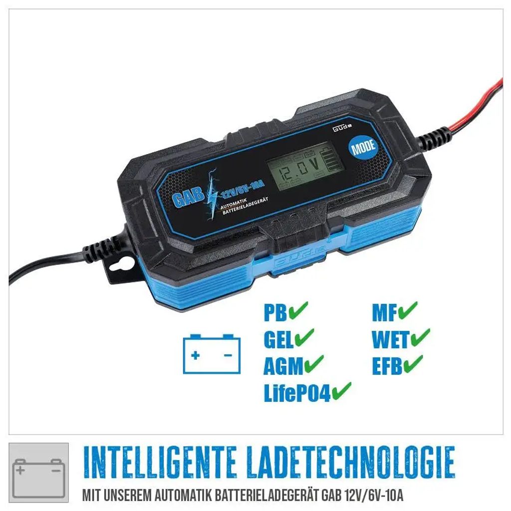 Automatická nabíjačka batérií GÜDE GAB 12V/6V-10A je inteligentné zariadenie určené pre nabíjanie 2 akumulátorov. Vďaka plne automatickému, mikroprocesorom riadenému systému je nabíjanie maximálne efektívne a zároveň šetrné k batérii. Nabíjačka je vhodná pre menšie akumulátory v skútroch, motocykloch, štvorkolkách a podobných vozidlách, ale zvládne aj pulz (2) akumulátorov s vyššou kapacitou. S GÜDE GAB 12V/6V-10A môžete nabíjať batérie s kapacitou od 4 až do max. 200 Ah.