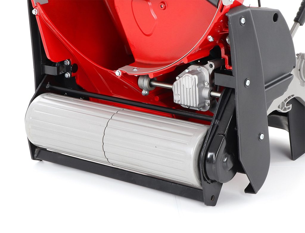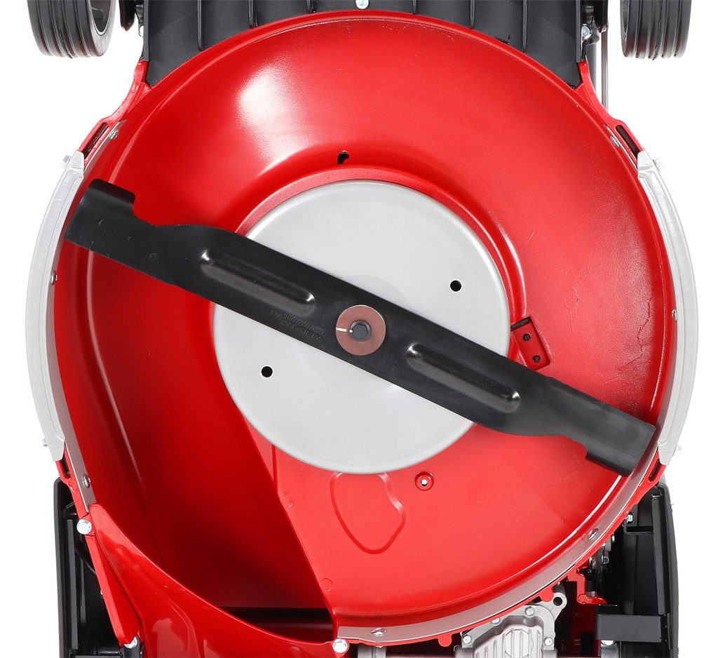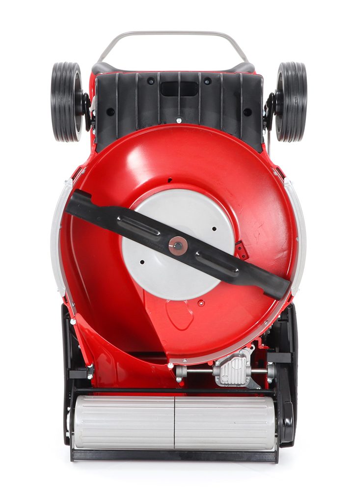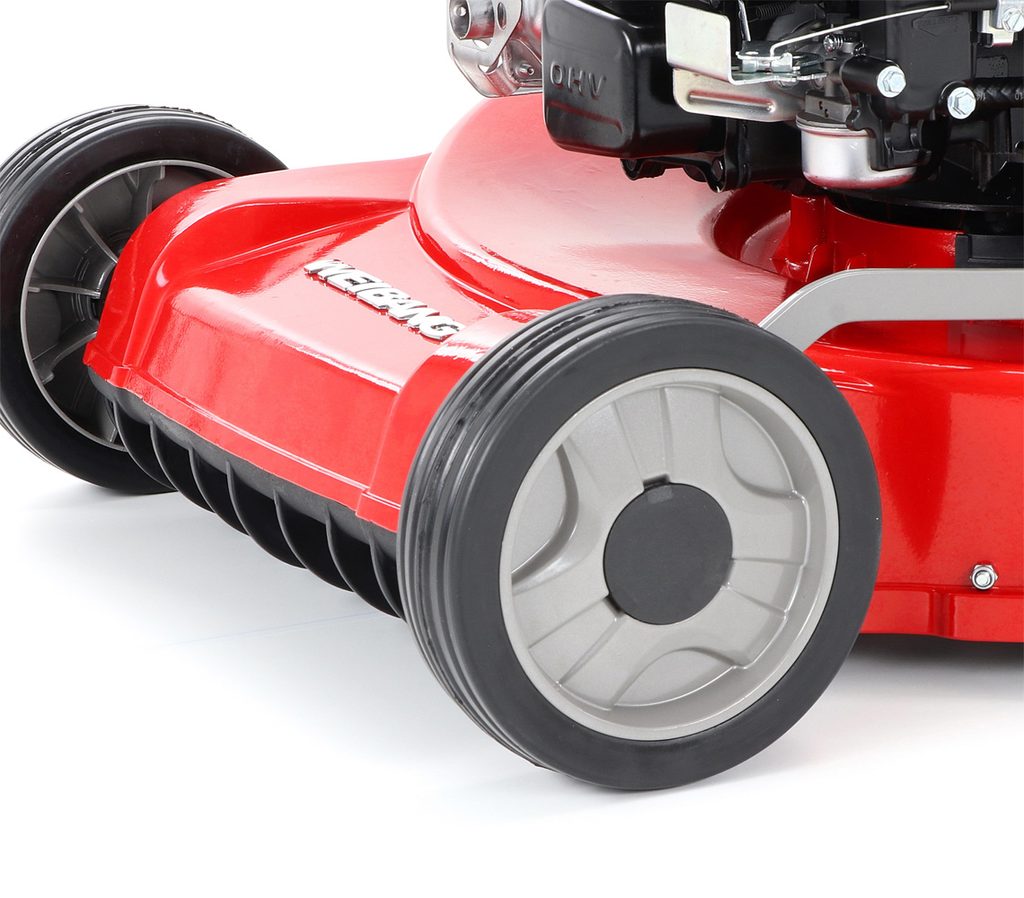 Pogumované hliníkové kolesá sú uložené v obojstranných guličkových ložiskách, centrálne nastavenie výšky kosenia je u tejto značky samozrejmosťou. Kosačka vyniká špeciálnym pevným a masívnym hliníkovým šasim.