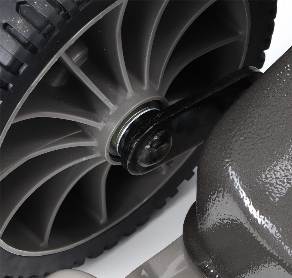 Pogumované sendvičové kolesá sú uložené v obojstranných kolesách. u tejto značky samozrejmosťou. Veľkým nadštandardom u tejto kosačky je použitá špeciálna trecia spojka na noži kosačky pod unášačom, ktorá je schopná preklzu noža pri narazení do pevnej prekážky.