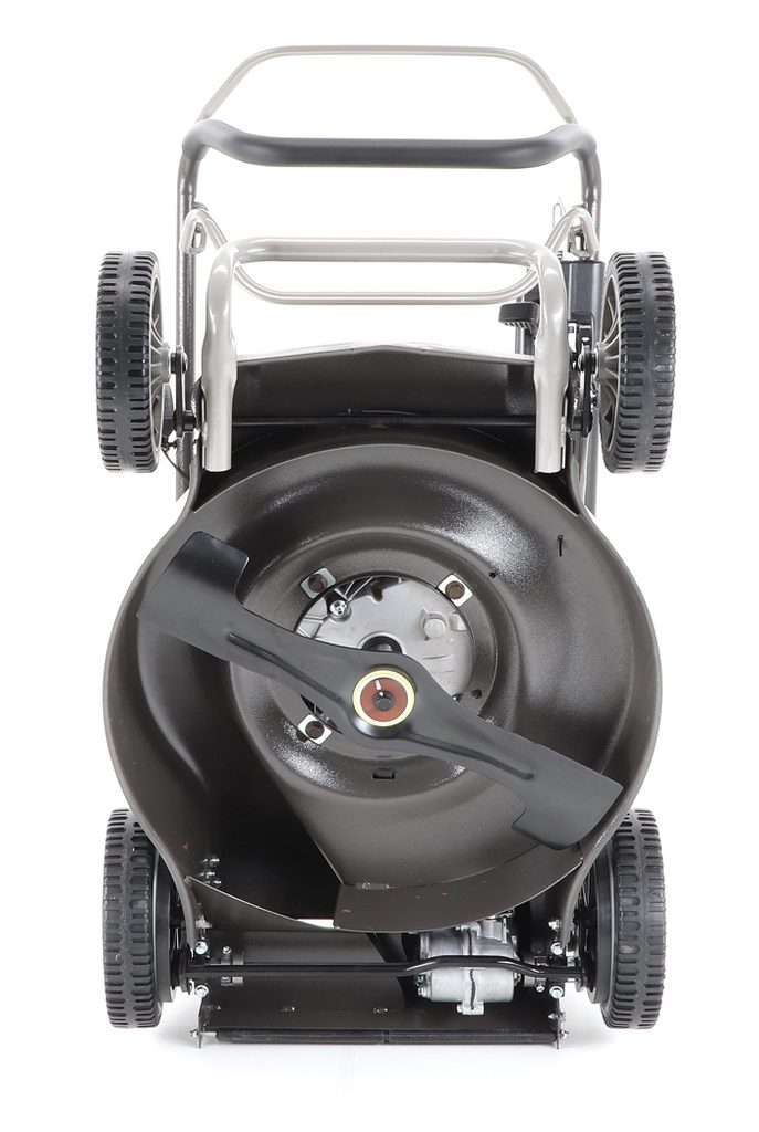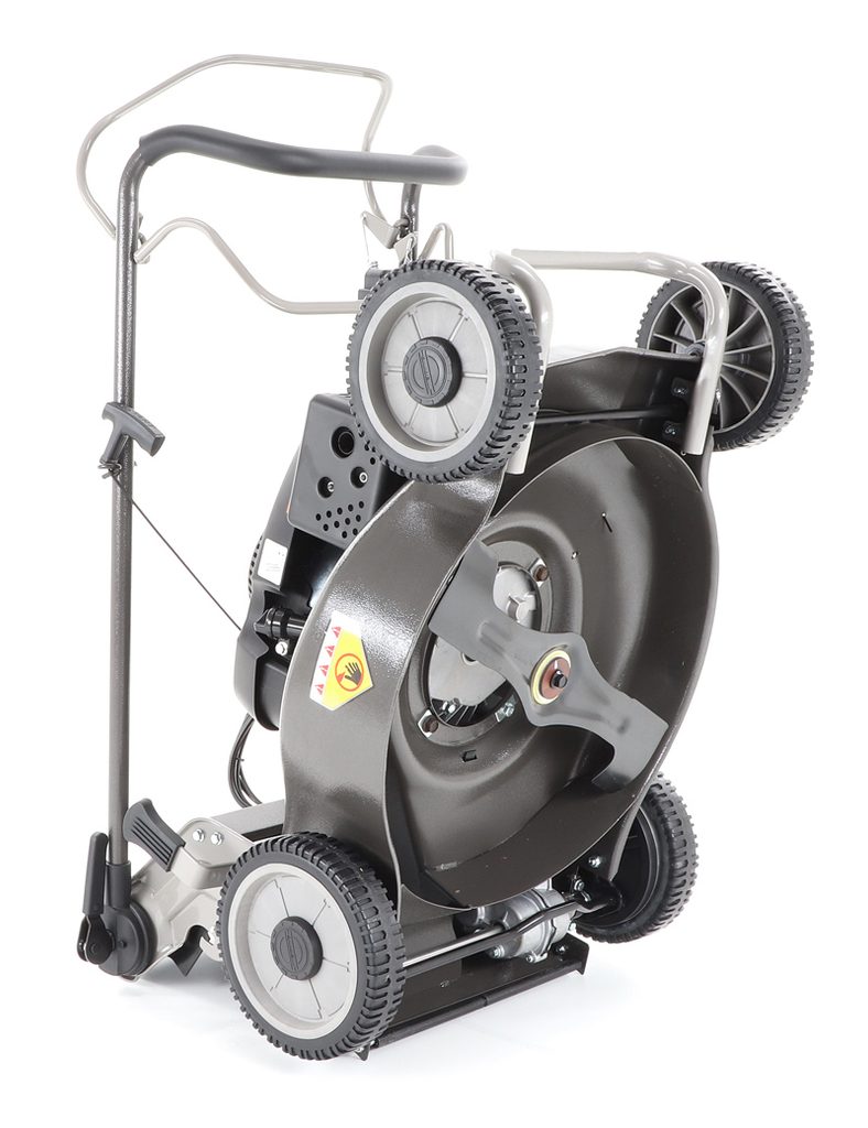 Novinkou kosačky je čistenie, servisovanie otočiť a postaviť na zadné špeciálne pätky šasi, týmto sa ľahko dostanete na spodnú časť žacieho ústrojenstva, uloženie náprav a prevodovku. Variabilná rýchlosť pojazdu: 2.9, 3.6, 4.4 km/hod vrstvy nástreku