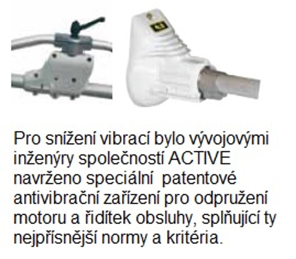 Hriadeľ krovinorezu ACTIVE je uložený do 6-tich špeciálne samomazných priechodiek z dôvodu zníženia vibrácií a pohodlia pri práci. Špeciálne patentované antivibračné zariadenie na odpruženie motora a riadidiel obsluhy, spĺňajúce tie najprísnejšie normy a kritériá.