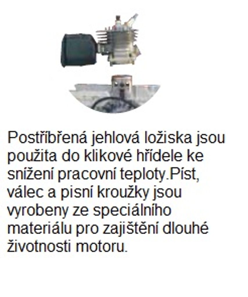 Kľukový hriadeľ s dvoma protizávažiami je vyrobený z vysoko kvalitnej ocele. Ultraľahký piest zo špeciálnej zliatiny železa má dva piestne krúžky na zaistenie dlhej životnosti motora. Žací nôž: 3-zub Bike
