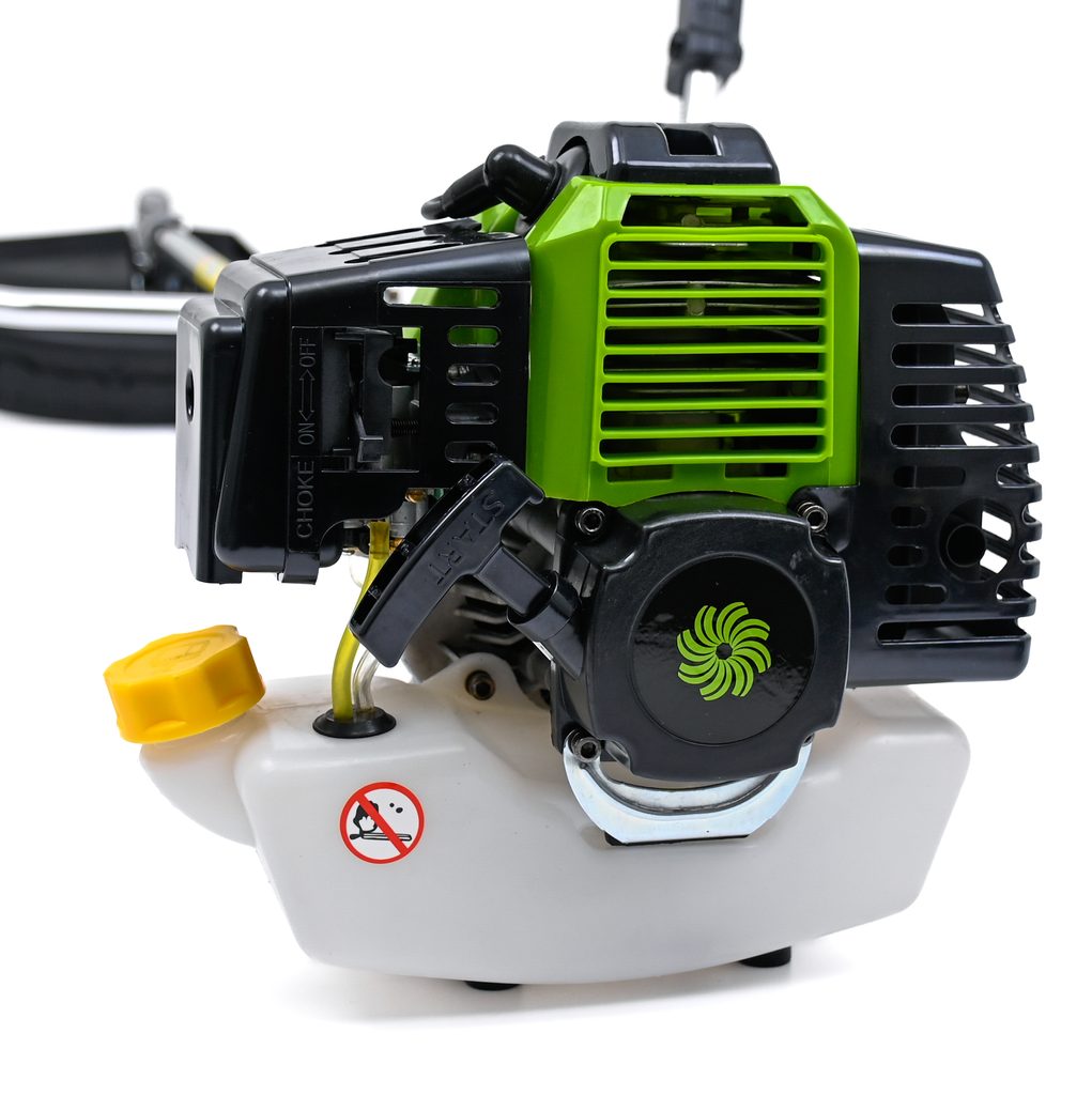 Dvojtaktný benzínový motor s objemom 43 cm³ je zlatou strednou cestou, ponúkajúci dostatočný výkon 1,4 kW pre bežné práce. Dvojitá ergonomicky tvarovaná rukoväť a nastaviteľný popruh na obe ramená zaisťujú maximálny komfort pri kosení väčších plôch.
