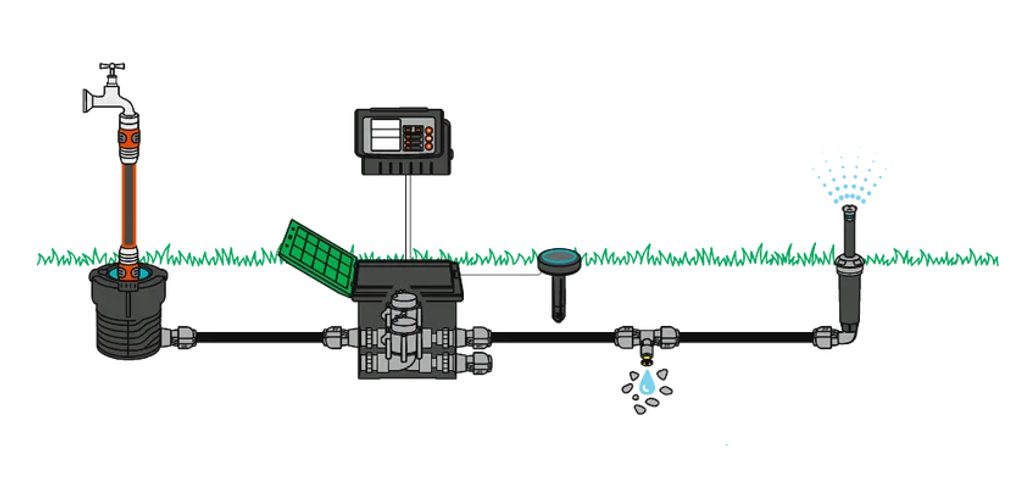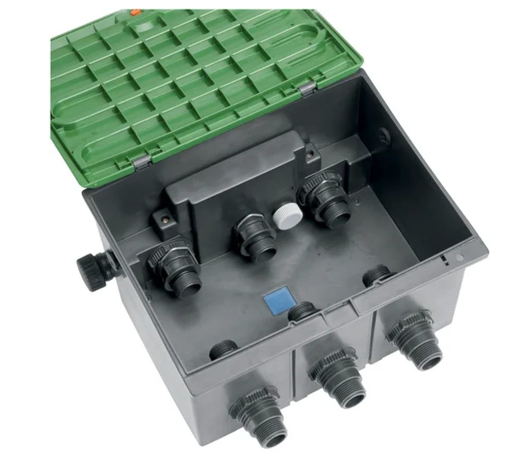Spojovací box je vodotesný a umožňuje ľahké a úhľadné pripojenie kábla 24 V. Pomocou centrálnej vypúšťacej krytky je možné prívodné potrubie vypustiť pred prvým mrazíkom. Kryt je možné v záujme ochrany pred deťmi zaistiť. Box na ventily V3 od spoločnosti GARDENA je opatrený 1 "vonkajším závitom. mrazu