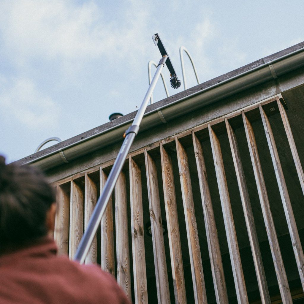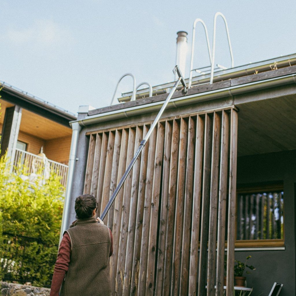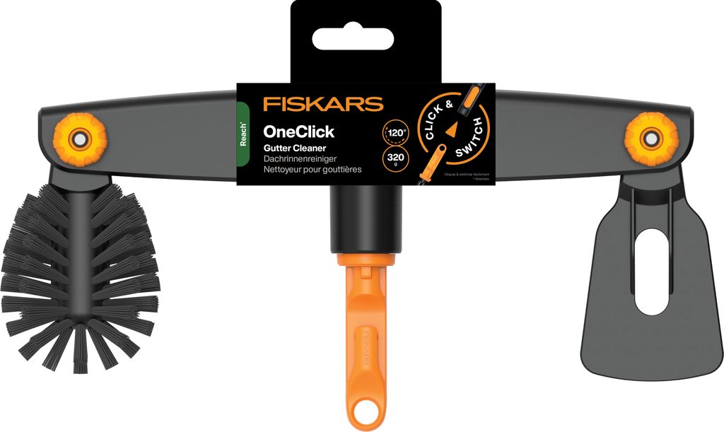 Čistič odkvapov Fiskars OneClick je určený na údržbu strešných žľabov priamo zo zeme. Kombinuje škrabku na odstránenie usadených nečistôt a zaoblenú kefu na finálne dočistenie, takže odkvapy vyčistíte rýchlejšie bez nutnosti nástroj počas práce meniť.