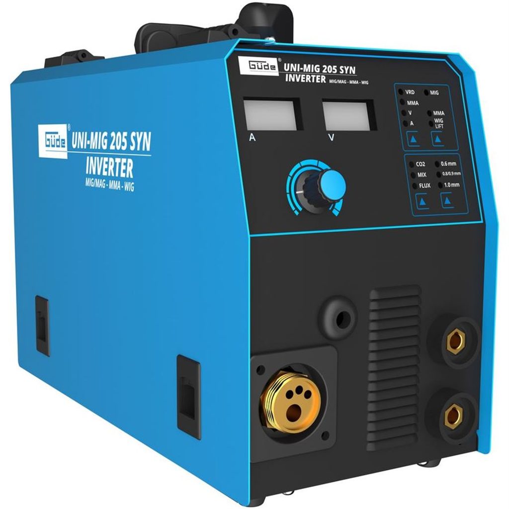 Invertorová zváračka Uni-Mig 205 SYN patrí medzi univerzálne invertorové zváračky v produktovom rade spoločnosti Güde. So zváračkou Uni-Mig 205 SYN sú možné prakticky všetky štyri zváracie procesy: MIG-MAG, MMA (zváranie elektródou), Flux (zváranie plneným drôtom) i zváranie WIG (voliteľné).