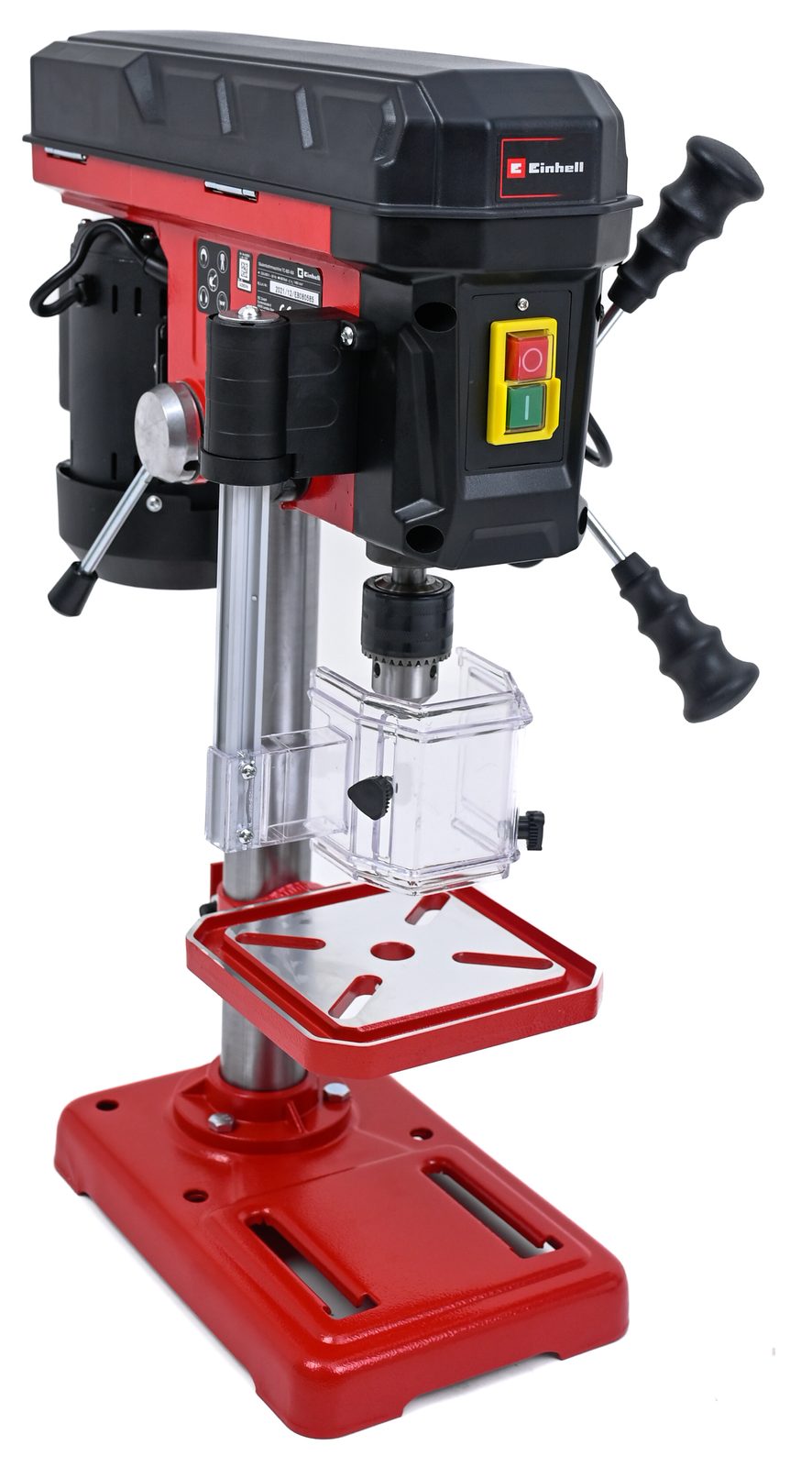 Bezpečnostný sklápací kryt chráni pred odletujúcimi trieskami a zvyšuje bezpečnosť práce. Vypínač s podpäťovou ochranou zabraňuje nechcenému opätovnému spusteniu stroja. Vŕtacie vreteno s guličkovými ložiskami navrhnuté pre dlhodobé používanie zaručuje spoľahlivý chod vŕtačky.