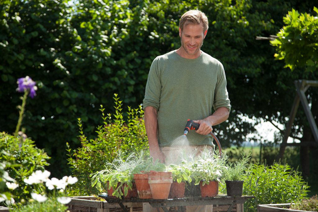 Zavlažovacia hlavica a prípojka sú vyrobené z kovu a sú extrémne trvanlivé. Ergonomická rukoväť s mäkkými plastovými prvkami umožňuje optimálne pohodlie počas práce. Prietok vody je možné plynule nastaviť.