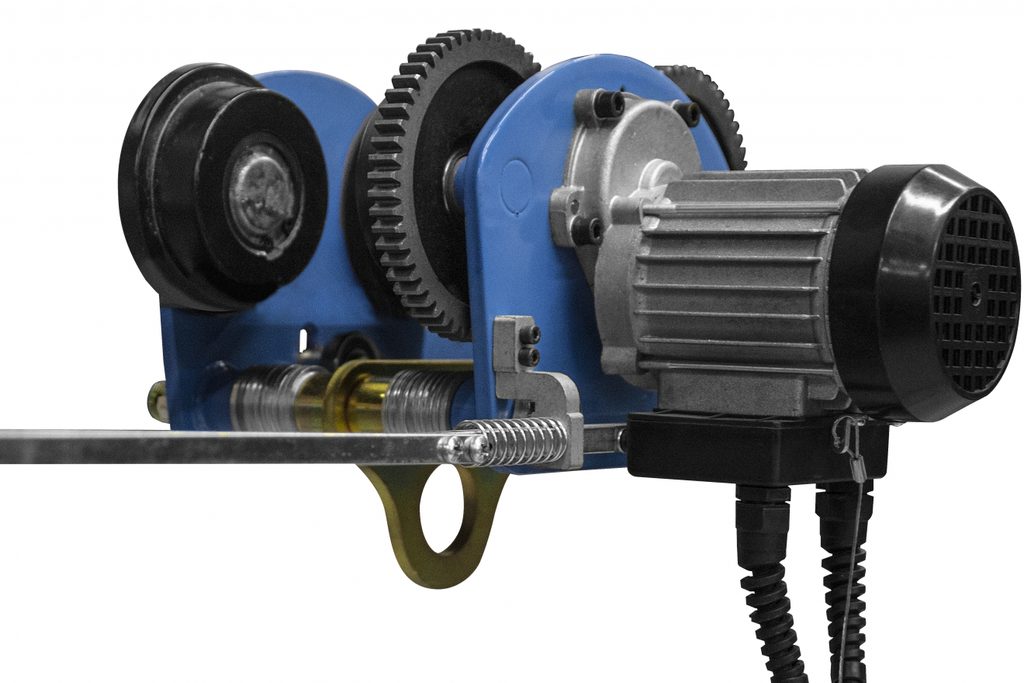 Elektrická žeriavová mačka, určená k horizontálnemu presúvaniu řeťazových kladkostrojov/lanových zdvihákov so zavesenými 9 bremenami (max. kg).