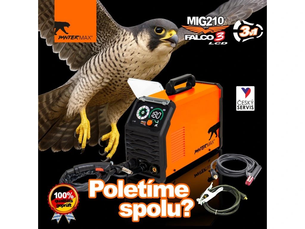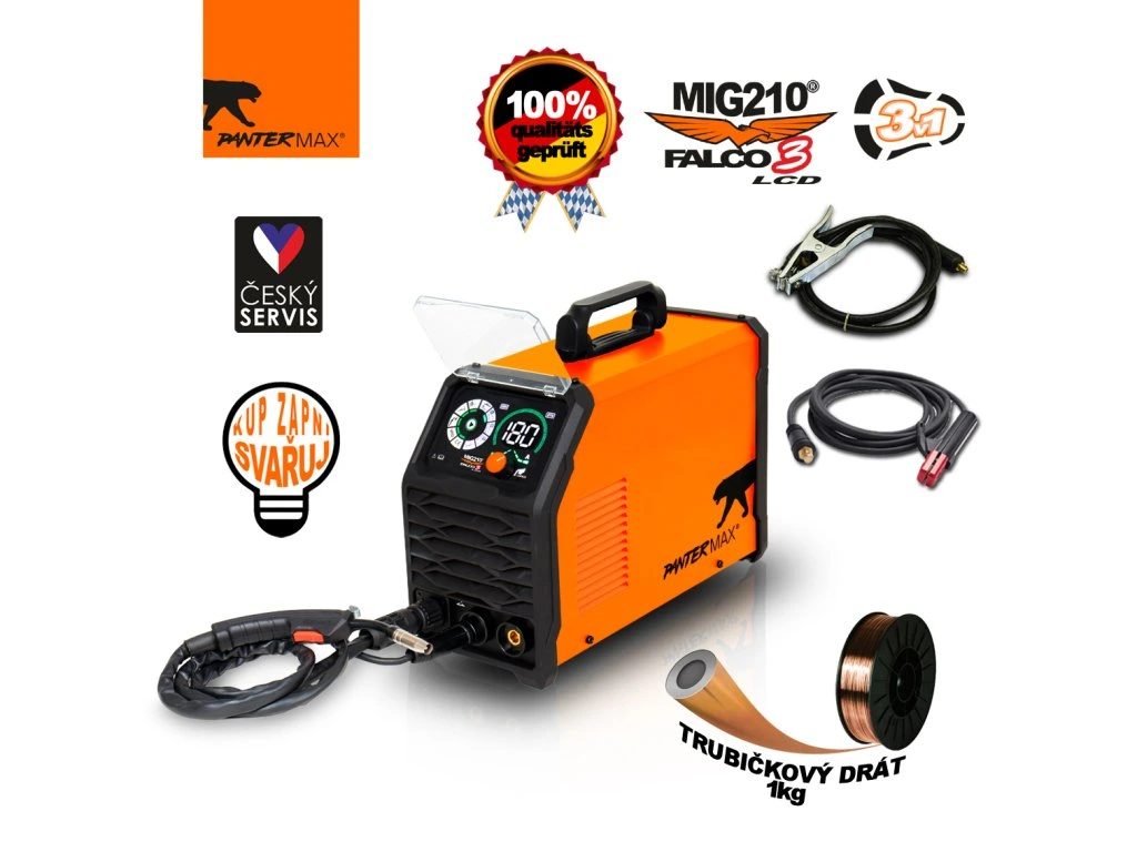 PANTERMAX® MIG210FALCO® 3 LCD je profesionálna IGBT invertorová zváračka riadená 32-bitovým procesorom. Vďaka jednoduchej zmene polarity umožňuje zdroj zváranie metódou MIG/MAG za použitia ako štandardných plných drôtov v ochrannej atmosfére plynu, tak aj trubičkových drôtov s ochranným plynom alebo bez. IGBT technológia umožňuje významné zníženie hmotnosti a rozmerov zdroja a zvýšenie účinnosti pri znížení spotreby energie.