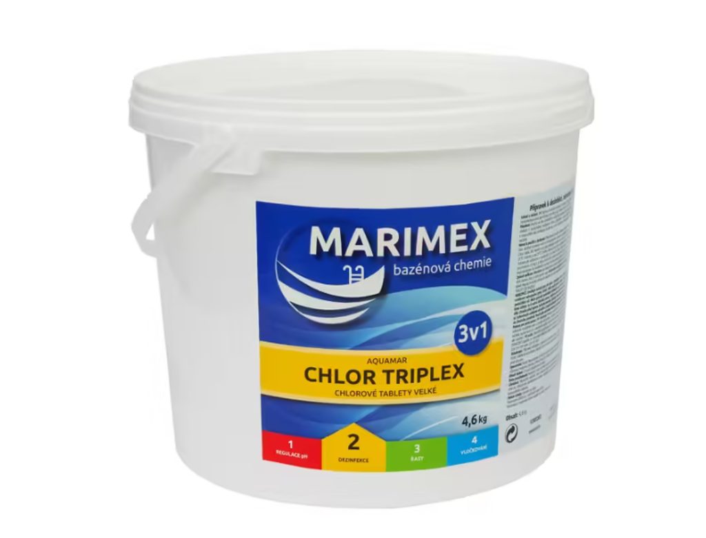 Veľké pomaly rozpustné tablety, na udržiavanie hladiny chlóru, proti riasam, plesniam, baktériám a vírusom, hmotnosť 4,6 kg.