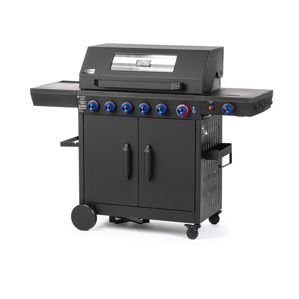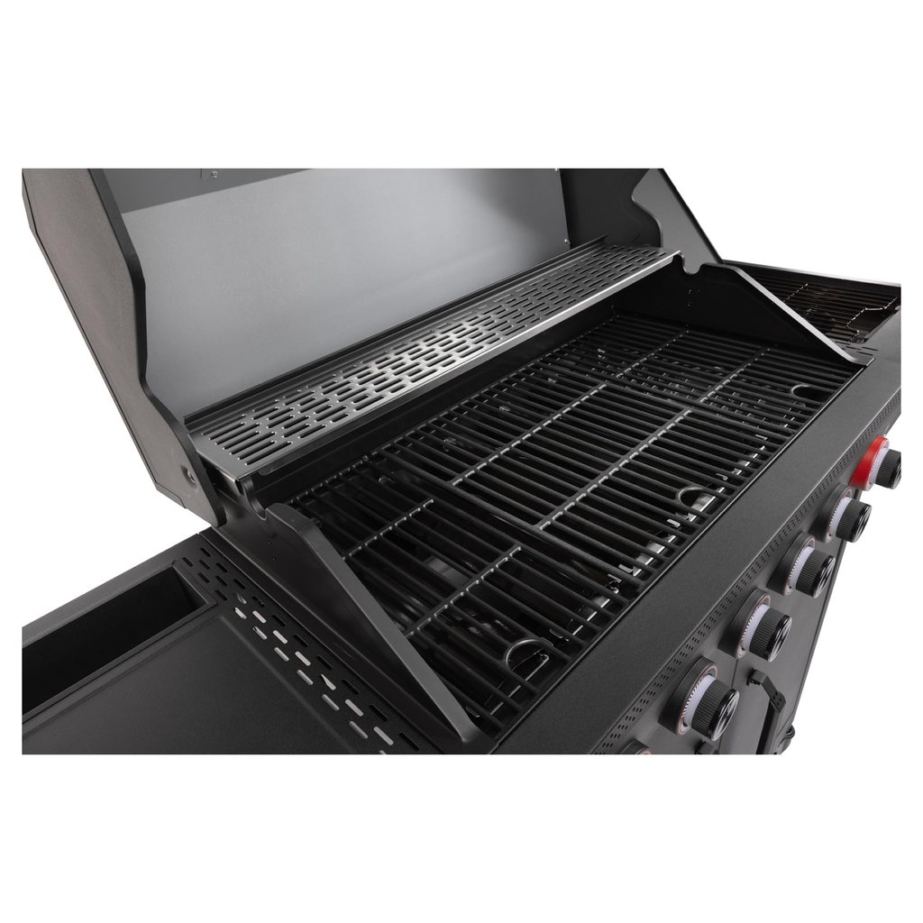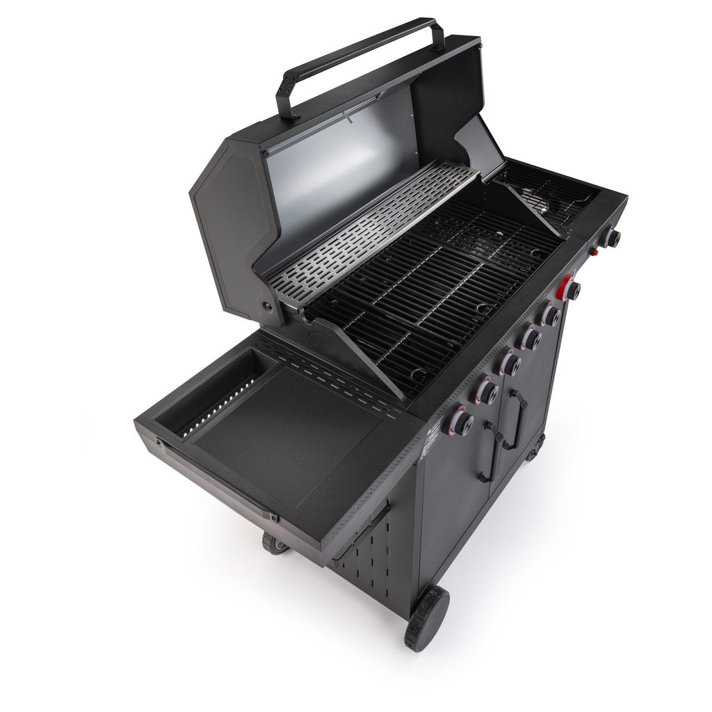 Na grilovacej ploche s rozmermi 82 × 42 cm pripravíte veľké množstvo jedla naraz, takže nemusíte nič robiť po častiach. Podsvietené ovládacie gombíky vám umožnia mať všetko pod kontrolou aj za tmy, a vďaka praktickým háčikom a odkladacím plochám budete mať potrebné náčinie vždy na dosah.