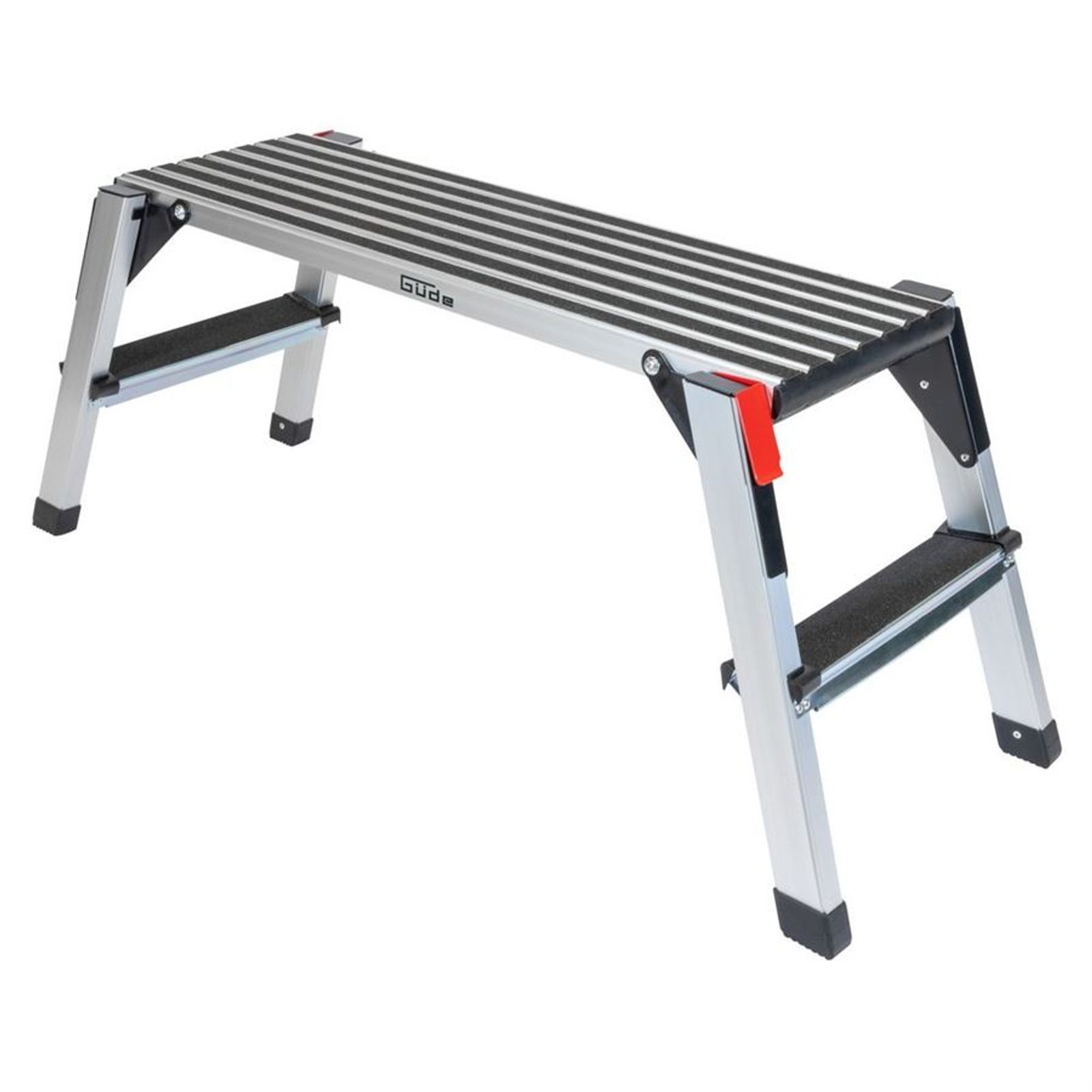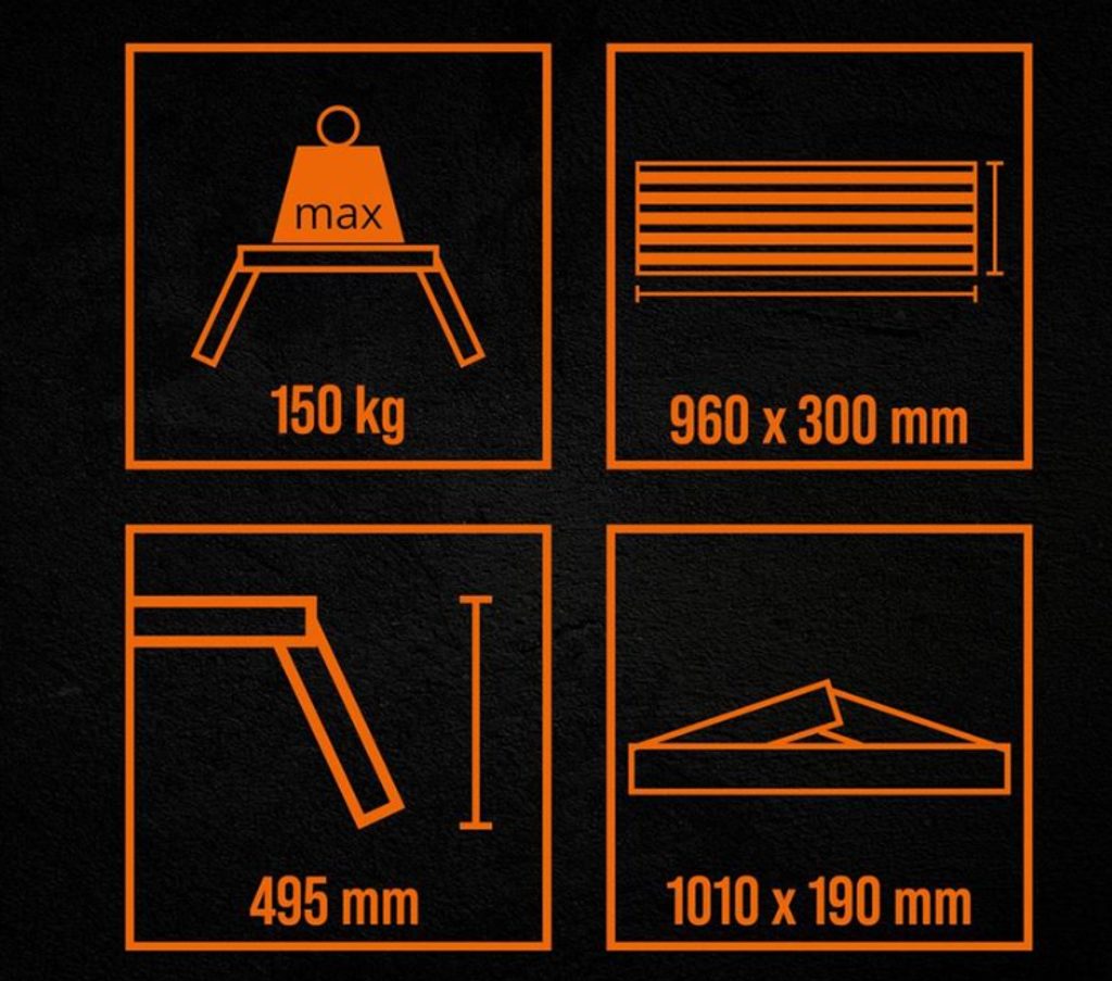 Plošina je vybavená protišmykovou úpravou na ploche aj schodíkoch, čo zaisťuje stabilnú a bezpečnú oporu pri práci. Súčasťou je bezpečnostný klip, ktorý zaisťuje stabilitu plošiny v rozloženom stave.