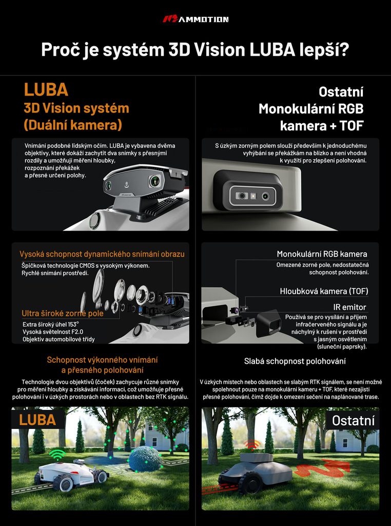 Binokulárny 3D Vision modul sleduje dvoma kamerami priestor pred robotickou kosačkou. Zaistí fungovanie kosačky aj v prípade kolísania satelitného signálu a bez ovplyvnenia funkcie kosačky pri zhoršených svetelných podmienkach.