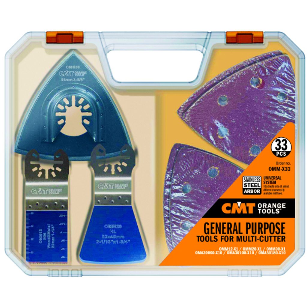 sada príslušenstva CMT k oscilačnému multifunkčnému náradiu (33 ks) je kompletné riešenie pre rezanie, úpravu povrchov a renováciu. Univerzálny upínací systém zaisťuje rýchlu výmenu nástrojov a širokú kompatibilitu s väčšinou oscilančných nástrojov na trhu.