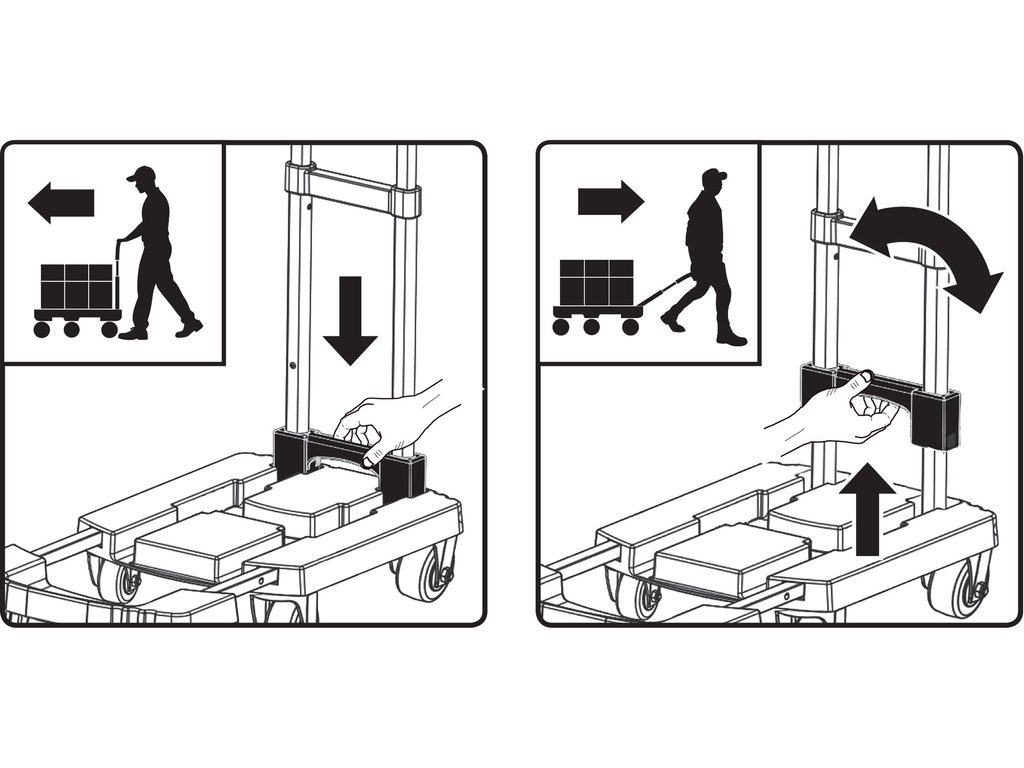 Teleskopická rukoväť s možnosťou jej fixácie v troch výškach 53-96-106cm (merané od podlahy) a tiež možnosťou nastavenia ako pre tlačenie tak aj ťahanie vozíka (push) rukoväť zafixovať k podstave vozíka a pre ťahanie je rukoväť naopak v smere výšky variabilne polohovateľná.