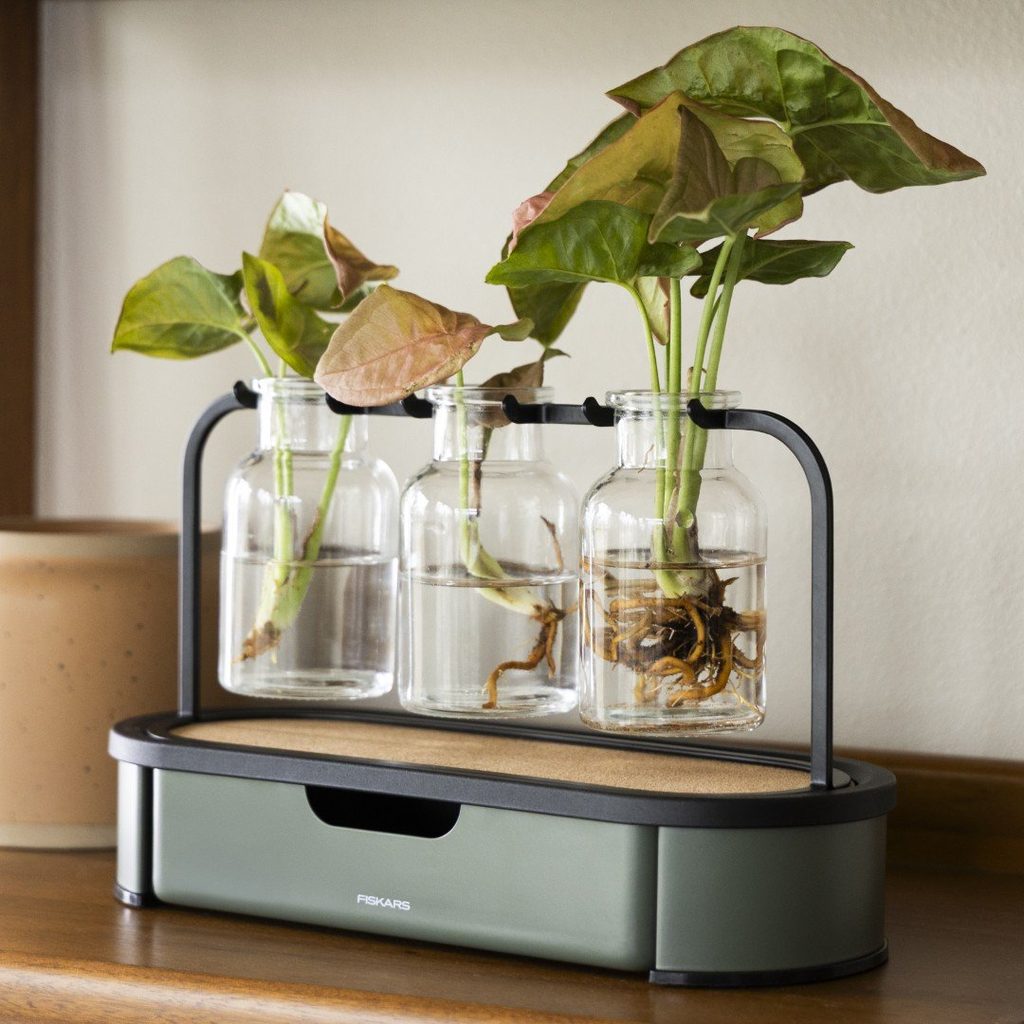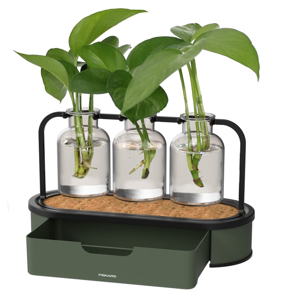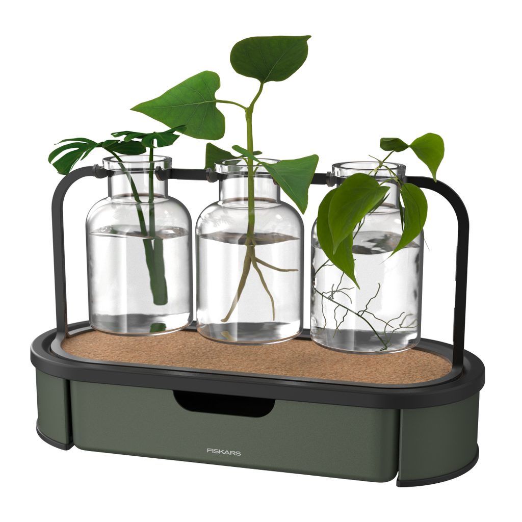 Stanica na množenie rastlín Fiskars je praktické a zároveň dekoratívne riešenie na zakoreňovanie odrezkov vo vode. Vďaka kompaktnému usporiadaniu môžete viac odrezkov umiestniť pod jeden svetelný zdroj, čo uľahčuje vytvorenie stabilných podmienok pre rast, najmä v zimných mesiacoch alebo v interiéri s obmedzeným osvetlením.