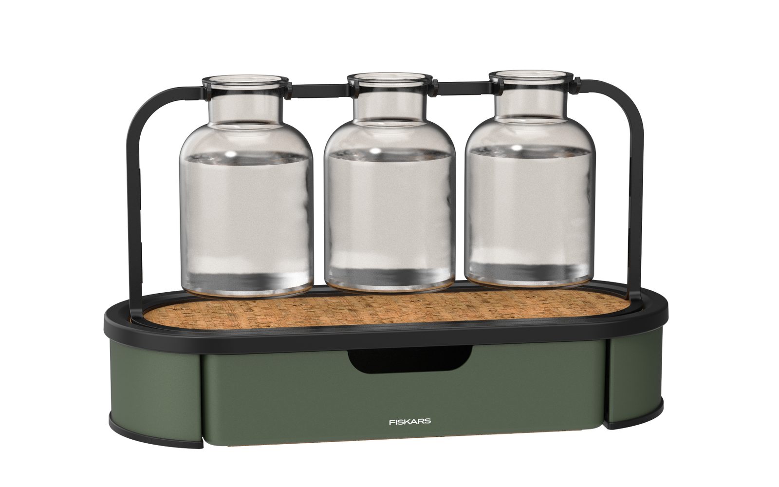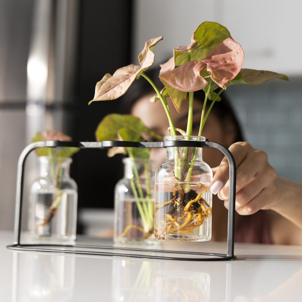 Priehľadné sklenené nádoby umožňujú kontrolu hladiny vody aj vývoja koreňov a ich tvar podporuje bezpečné vybratie zakorenenej rastliny. Stabilný kovový stojan s práškovým lakom dobre odoláva vlhkosti pri bežnom používaní a integrovaný úložný priestor sa hodí na drobné pestovateľské pomôcky.