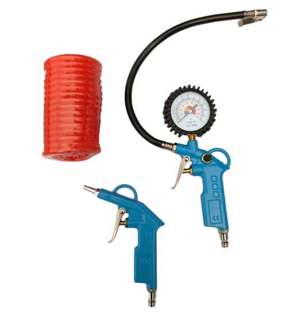 Pneu sada 3 dielna určená na meranie tlaku pneu, pištoľ, hadica špirálová. Táto sada je ideálnym pomocníkom pri práci s kompresorom v okolí domu alebo v garáži. Nafúkanie bazéna, bicyklov alebo člnov, ofuk pilín či prachu, s tým všetkým táto sada uľahčí a zefektívni prácu. osadená rýchlospojkami