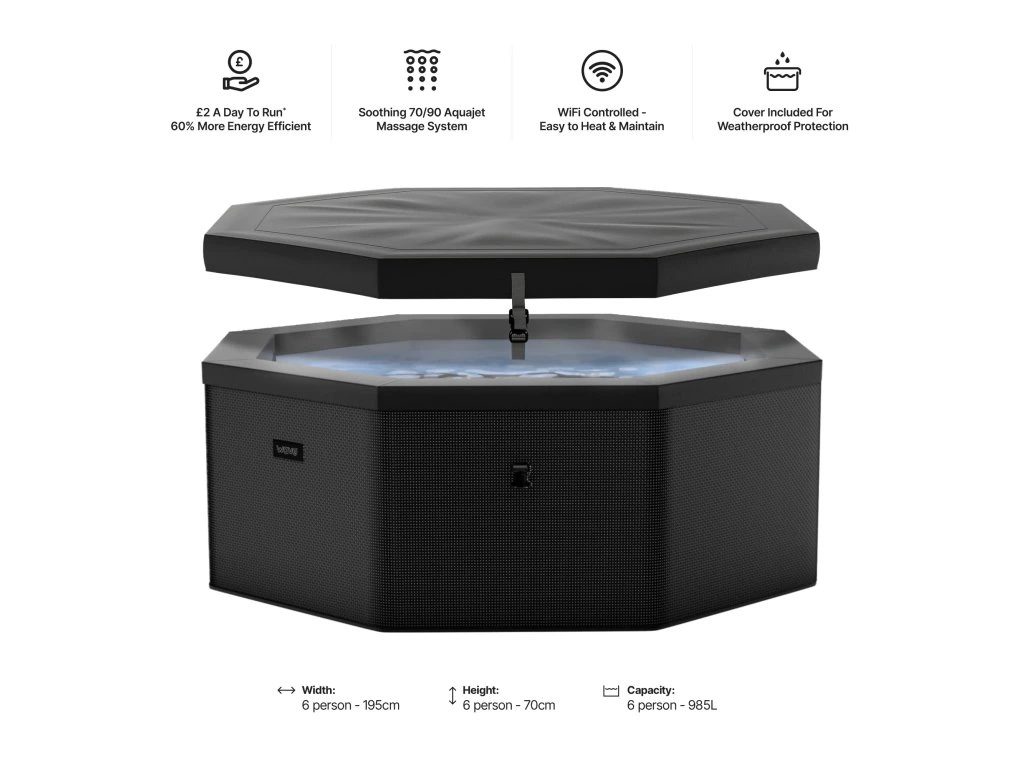 CF Wave COMO 6 CHARCOAL BLACK je moderná nafukovacia vírivka s pevnou penovou konštrukciou, ktorá prináša dokonalú kombináciu komfortu, úspory energie a dizajnu. Ponúka priestor až pre 6 osôb, silný masážny systém a inteligentné ovládanie cez WiFi – ideálne riešenie na relax doma aj na záhrade.