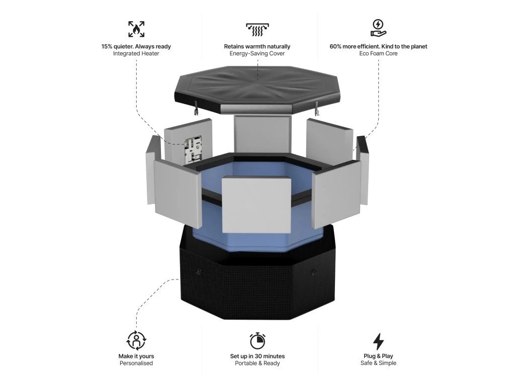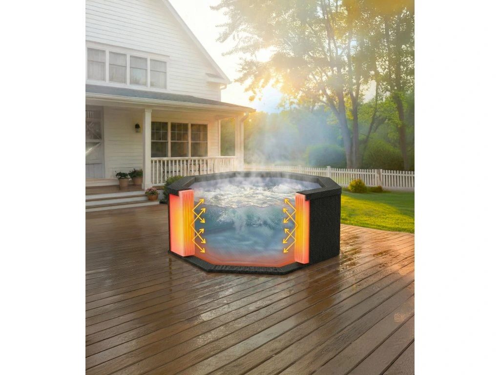 Integrovaný ohrev umožňuje nastavenie teploty až na 40 °C, pričom systém automaticky udržiava nastavenú teplotu. Vďaka inteligentnej funkcii Freeze Protect sa vírivka sama zapne pri poklese teploty a zabráni zamrznutiu vody. Veľkou výhodou je tiež WiFi ovládanie, vďaka ktorému môžete vírivku ovládať odkiaľkoľvek – nastavíte teplotu ešte pred príchodom domov.