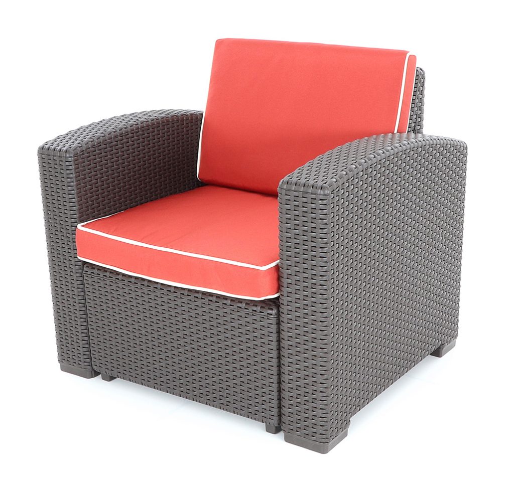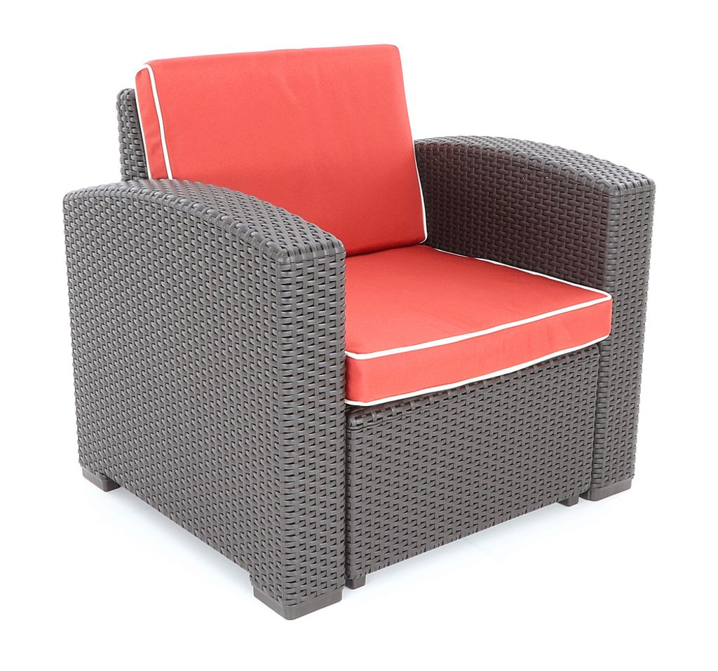 > pre jej vzhľad, ale aj pre ľahkú montáž a nenáročnú údržbu. Umelý ratan je moderný materiál s dlhou životnosťou a extrémnou odolnosťou voči poveternostným vplyvom aj UV žiareniu. Nepodlieha hnilobe ani plesni, nevsakuje vodu a dážď alebo slnečné lúče mu neublížia. Preto je ideálnou voľbou aj do priestorov s vyššou vlhkosťou, ako je okolie bazéna či vírivky. Údržba tejto záhradnej zostavy je rýchla a jednoduchá, stačí opláchnuť prúdom studenej vody a nábytok bude opäť ako nový. Doprajte si pohodové chvíle a jedinečnú atmosféru s odolným a dizajnovým záhradným posedením Portoriko red DeLuxe VeGA, ktoré vám bude slúžiť po mnoho sezón. Rozmery kresla: 83 x 71 x 75 cm cm| Kategória | Zostavy nábytku |