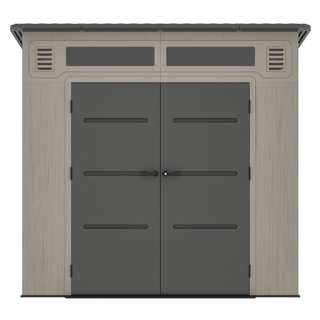 Pohodlný prístup dovnútra zabezpečujú široké dvojkrídlové dvere s praktickým dvojitým madlovým zámkom, ktoré uľahčujú manipuláciu aj s objemnejšou technikou, napríklad kosačkami alebo záhradnými vozíkmi. Interiér je navyše príjemne presvetlený vďaka svetlíku v streche a bočnému polykarbonátovému oknu, čo zvyšuje komfort pri používaní počas dňa.