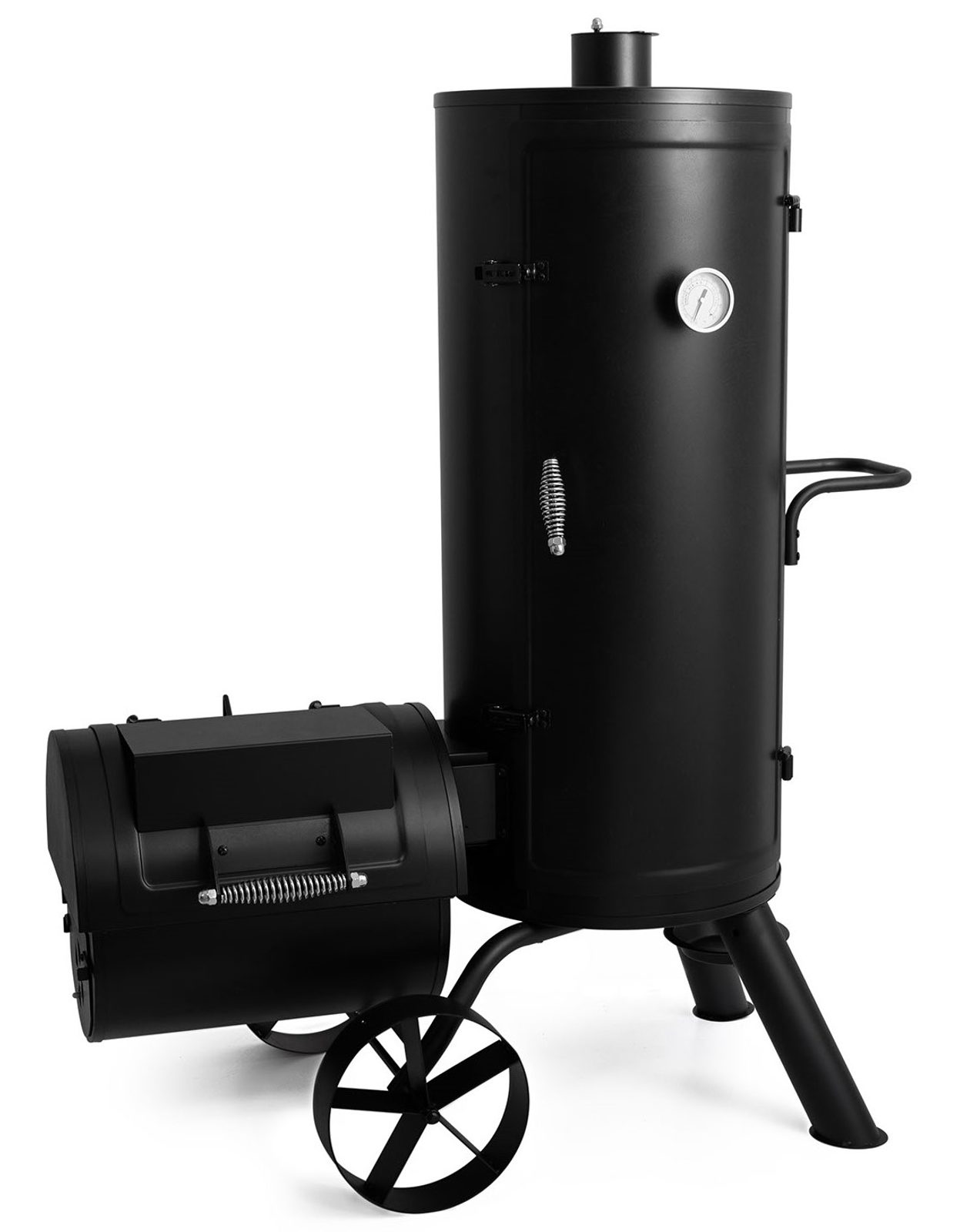 Na zadnej strane udiarne sú malé dvierka, ktorými môžete pohodlne dopĺňať vodu v miske na vodu bez toho, že by došlo k prudkému zníženiu teploty v udiarni otvorením veľkých hlavných dvierok. Pod udiarňou nájdete ešte praktickú misku na odkvapkávajúci tuk. zarážkami, vďaka ktorým je veko pri otvorení bezpečne fixované. V spodnej časti grilu je rošt na drevené uhlie a nad ním smaltovaný grilovací rošt. Bočné dvierka grilu umožňujú prístup k kúrenisku, takže z grilu po grilovaní ľahko a pohodlne vyberiete popol. orientáciu pri regulácii vzduchu aj pre zistenie optimálnej teploty údenia.