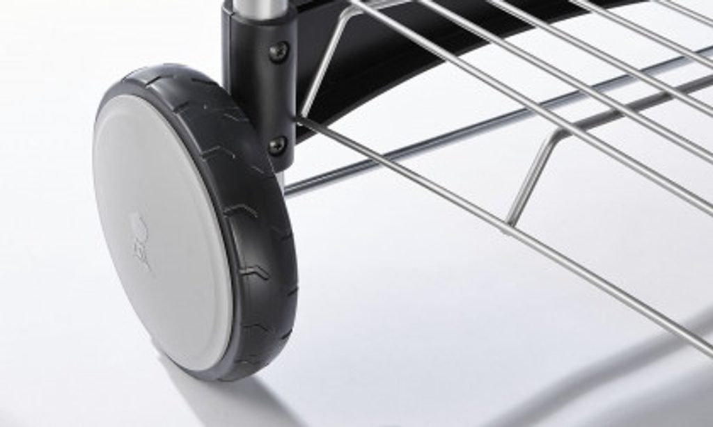 Sklápací postranný stolík v komfortnej výške šetrí veľa miesta pri skladovaní. Vozík je vybavený 2 veľkými kolesami a 2 kolieskami s aretáciou pre stabilnú polohu.